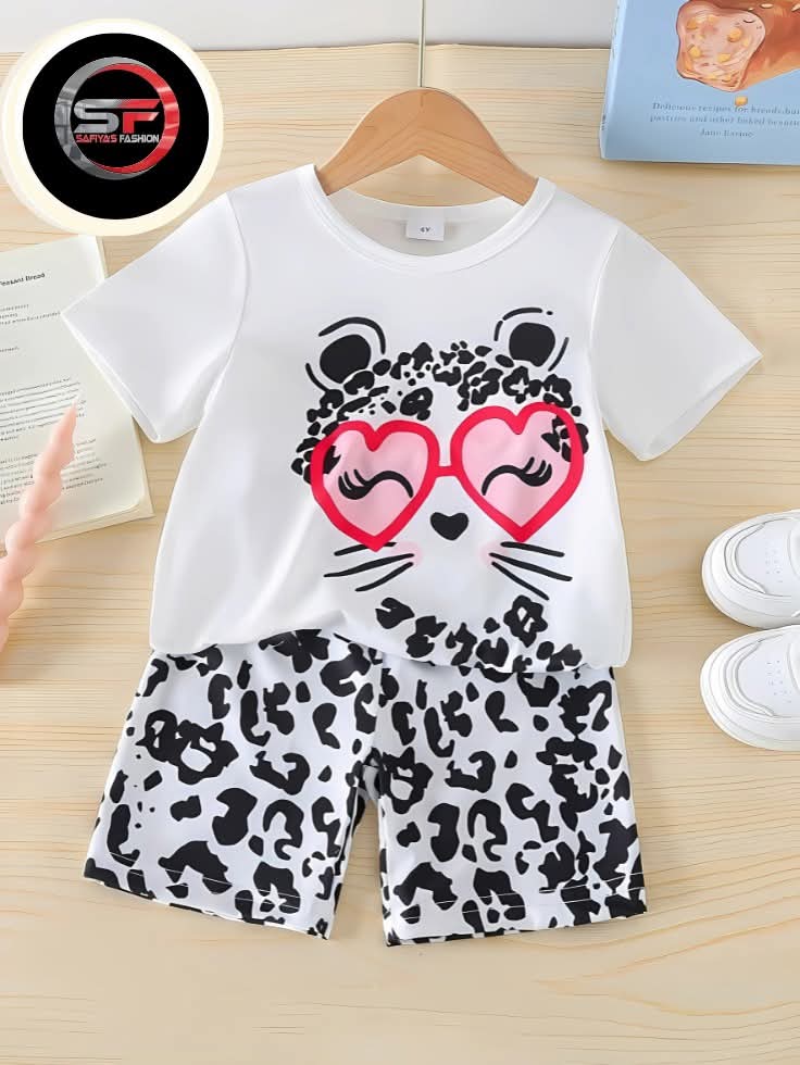 আপনার ছোট্ট মেয়ের প্রতিদিনের পোশাকে যোগ করুন কল্পনা ও স্টাইলের ছোঁয়া সাফিয়া’স ফ্যাশনের হার্ট আইস লেপার্ড কটন সেটের মাধ্যমে। সাদা রঙের শর্ট স্লিভ টপসটিতে রয়েছে একটি কার্টুন লেপার্ডের মুখ, যার চোখ দুটি বড় গোলাপি হৃদয় আকৃতির, সাথে রয়েছে কালো কান, গোঁফ ও নাকের playful detailing। এই ডিজাইনটি শিশুর পোশাকে যোগ করে একটি কিউট ও প্রাণবন্ত লুক। টপসের গোল গলা ডিজাইনটি আধুনিক এবং শিশুর জন্য আরামদায়ক।
